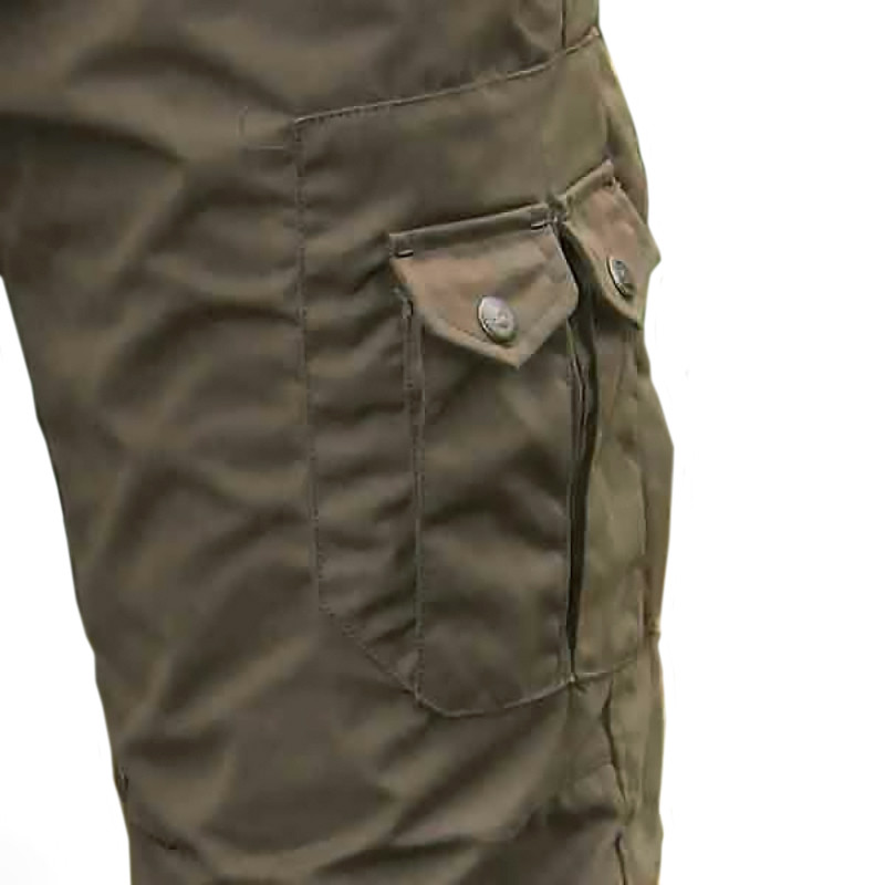 2 dziļas priekšējās kabatas, 2 bagāžas kabatas ar rāvējslēdzēju, naža kabata un 2 gurnu kabatas un elastīga jostasvieta.