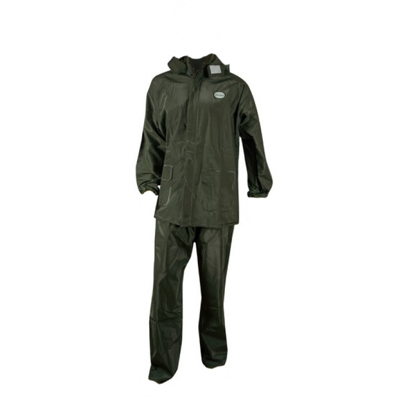 Prece ir divdaļīgs (bikses + jaka) lietus kostīms no izturīga PVC materiāla.