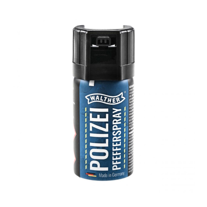 Walther Polizei 40 ml ir vācu piparu gāze ar 4 m diapazonu, kas, izmantojot universālu konisku uzgali, izšauj asa kapsaicīna mākoni.