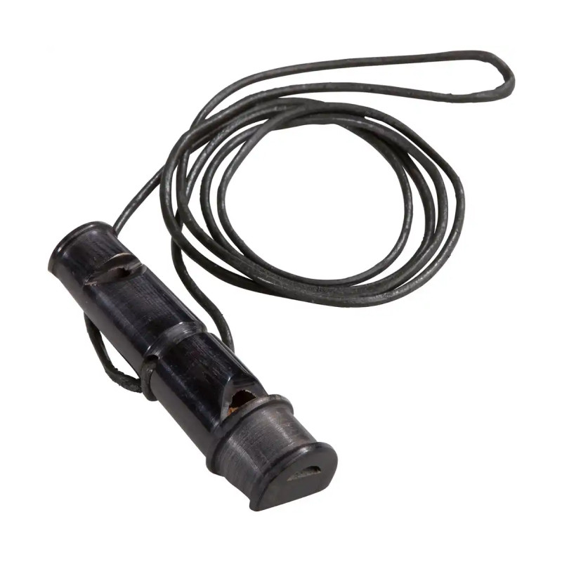 Divpusēja suņu svilpe, kas izgatavota no īsta bifeļu raga, ir 7.6 cm gara un aprīkota ar melnu ādas siksniņu (aptuveni 47 cm gara). Vienai pusei ir treļļu funkcija, otrai - asa svilpe.