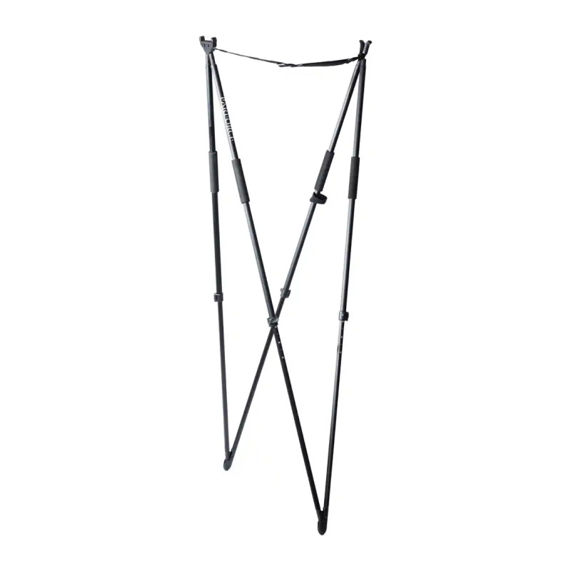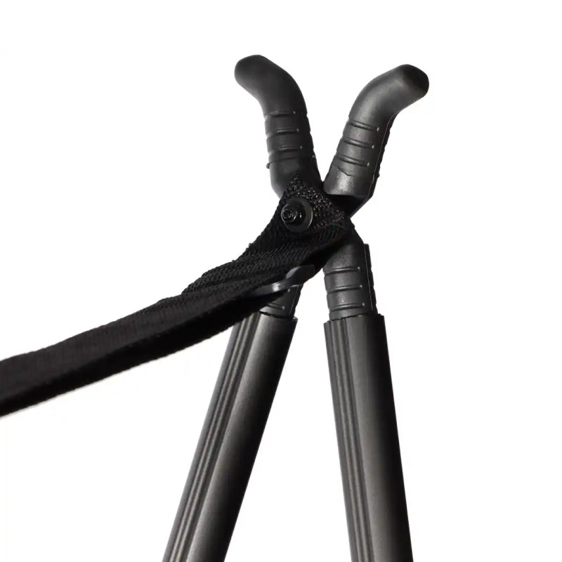 V-veida dakšas galva nūjas augšpusē brīvi rotē un atbalsta šauteni divos punktos, vēl vairāk palielinot stabilitāti šaušanas laikā.