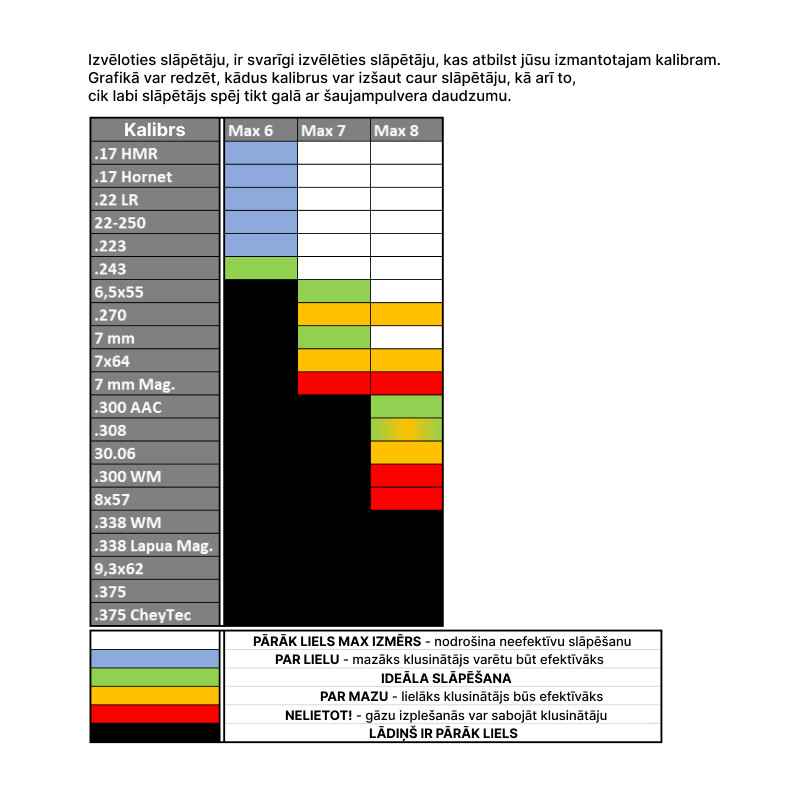 Šim trokšņa slāpētājam ir tilpums, kas ir piemērots mazākiem standarta kalibriem. Tas nav piemērots lietošanai ar magnum kalibriem.