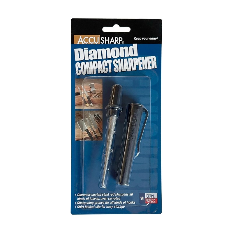 AccuSharp® Diamond Compact asināmais ir ar dimantu pārklāts tērauda stienis, ko izmanto visu veidu nažu un instrumentu asināšanai. Konusveida dimanta stienis ir paredzēts lietošanai uz zobainām virsmām un šaurām vietām, kā arī asmeņiem un instrumentu malām. Ar dimantu pārklātajam tērauda stienim ir asināšanas rieva, kas paredzēta lietošanai ar visu veidu āķiem, šautriņām un smailiem priekšmetiem. AccuSharp Diamond Compact asināmajam ir kabatas klipsis ērtai uzglabāšanai.