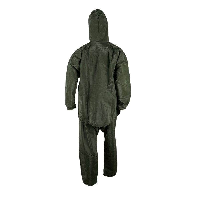 Prece ir divdaļīgs (bikses + jaka) lietus kostīms no izturīga PVC materiāla.
