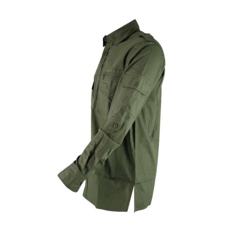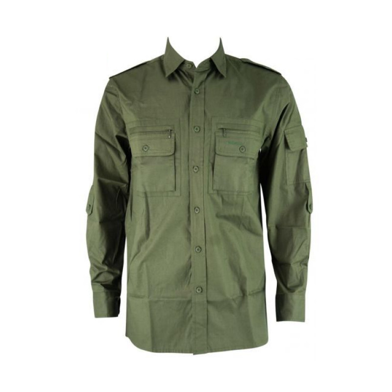 Univers krekls olīvzaļā krāsā, ideāli piemērots medībām un brīvajam laikam, izgatavots no vieglas kokvilnas poplīna ar divām rāvējslēdzēja kabatām uz krūtīm, kā arī divām piedurknes kabatām ar atloku.