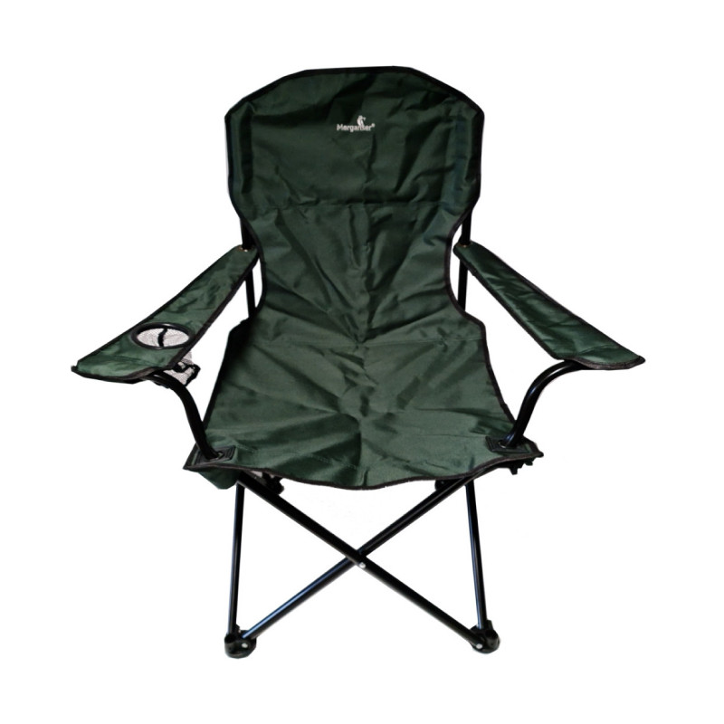 Šis klasiskais, zīmola Merganser, atzveltnes krēsls ir gan izturīgs, gan ērts. Roku balstā ir pudeles turētājs, dzērienu novietošanai un krēsls salokās, un atlokās dažu sekunžu laikā.