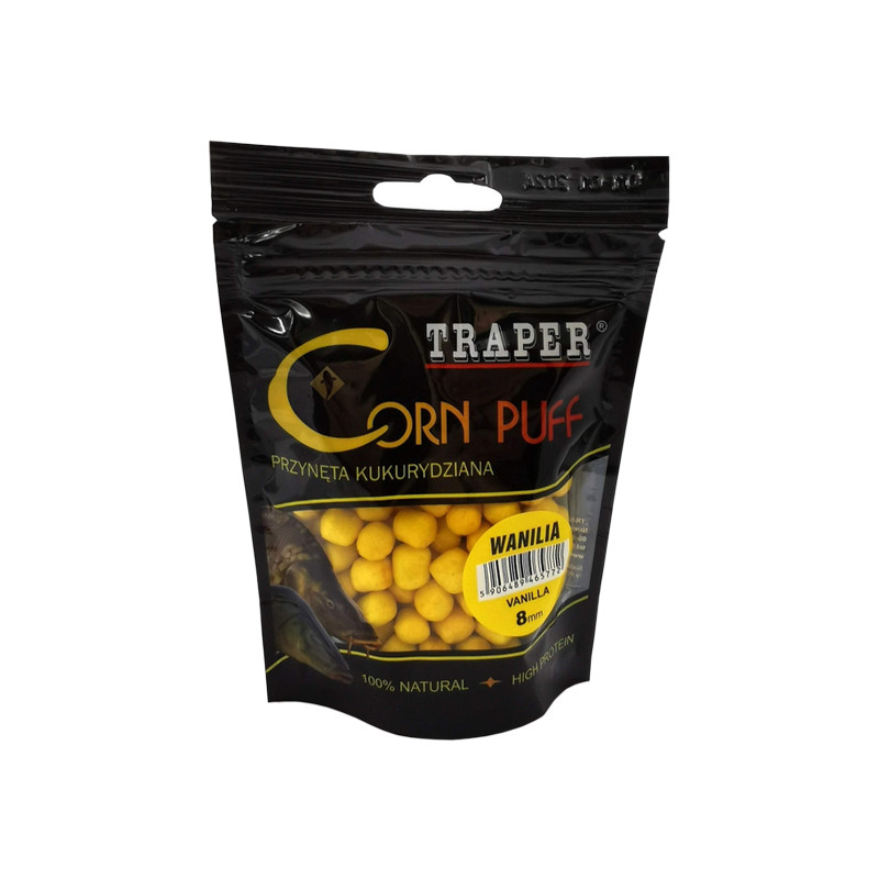 Šī spēcīgi smaržojošā peldošā ēsma piesaista zivis no liela attāluma. Pozitīvā peldspēja padara šo ēsmu īpaši efektīvu, makšķerējot uz lipīga, dubļaina, zāļaina dibena. Trapper Corn Puff darbojas apmēram 10-15 minūtes, pēc tam tas kļūst slapjš, iegūst zivīm ļoti patīkamu tekstūru, bet var nokrist no āķa. Tāpēc labāk ir nomainīt pufu un mest to no jauna.