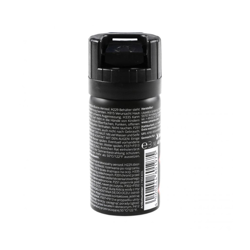 Walther Polizei 40 ml ir vācu piparu gāze ar 4 m diapazonu, kas, izmantojot universālu konisku uzgali, izšauj asa kapsaicīna mākoni.