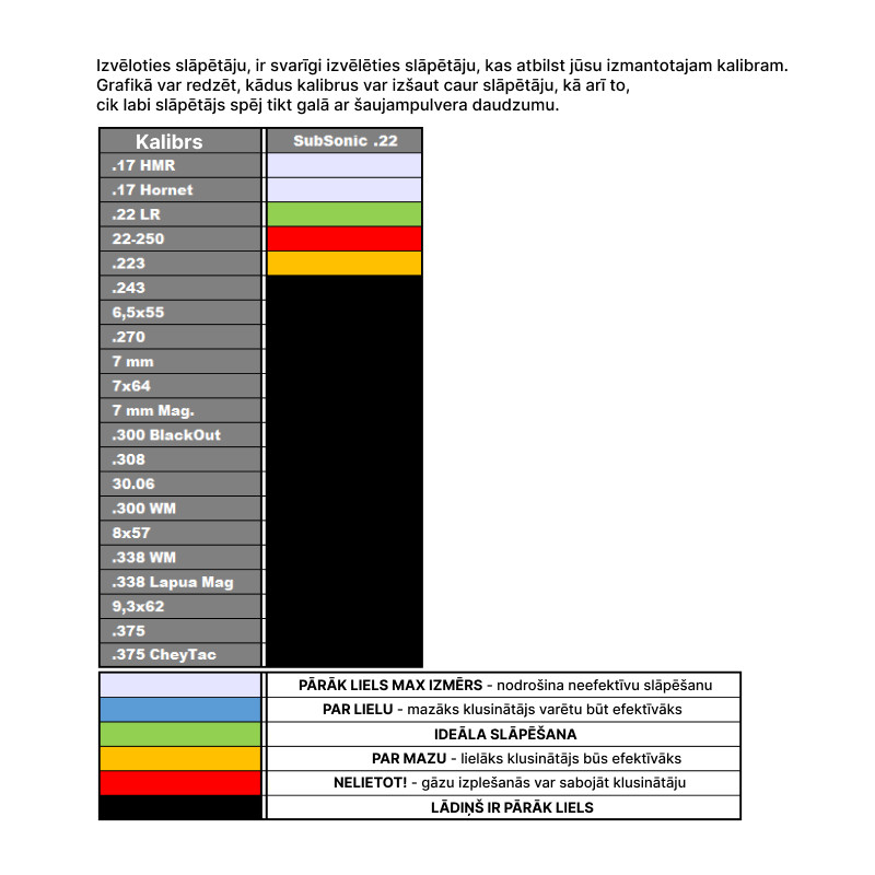 SubSonic .22 trokšņa slāpētājs ir īpaši izgatavots .22 kalibriem. Tā kā 22-250 ir liels šaujampulvera daudzums, šim kalibram nav ieteicams izmantot SubSonic .22. Šeit, piemēram. Sonic 35 ir daudz izturīgāka izvēle.