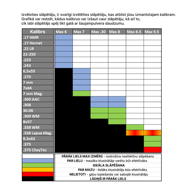 Paredzēts lielākiem kalibriem. Šis slāpētājs ir vislabāk piemērots tādiem kalibriem kā: 7 mm Mag., 300 Mag., 9,3 x 62 un .375