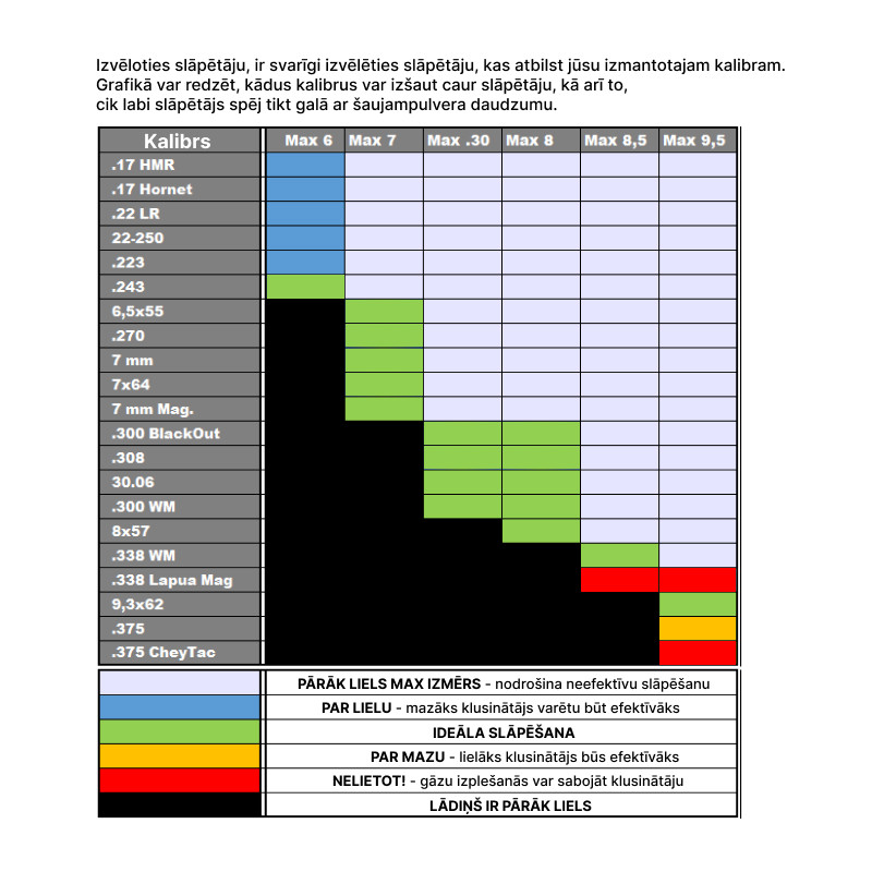 Šim trokšņa slāpētājam ir tilpums, ko var izmantot visdažādākajos kalibros. Šis trokšņa slāpētājs var aptvert gandrīz jebkuru kalibru no .243 līdz .375