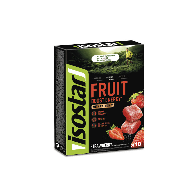 Fruit Boost marmalāde enerģijai satur ogļhidrātus (8g / 1 marmelādē) vitamīnu B1, vitamīnu PP, vitamīnu B5 un vitamīnu B6, kuri uzlabo vielmaiņu, ātrāk pārveidojot barības vielas enerģijā. Vitamīns B5, vitamīns B6 un vitamīns C palīdz samazināt nespēku un nogurumu. Isostar Energy Fruit Boost Strawberry satur arī kofeīnu (10mg / 1 marmelādē), kas sniedz tūlītēju enerģiju.