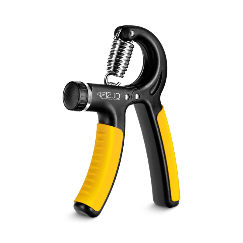 Zīmola 4FIZJO rokas trenažieris. Tā rokturi ir ergonomiski veidoti, lai mazie roku muskuļi netiktu pārslogoti un strādātu fizioloģiski. Rokturi ir aprīkoti ar neslīdošiem paliktņiem – tie nodrošina stingru satvērienu arī tad, ja treniņa laikā rokas ir nosvīdušas. Tam ir pretestības regulēšanas poga. Varat to pielāgot atkarībā no vajadzībām.