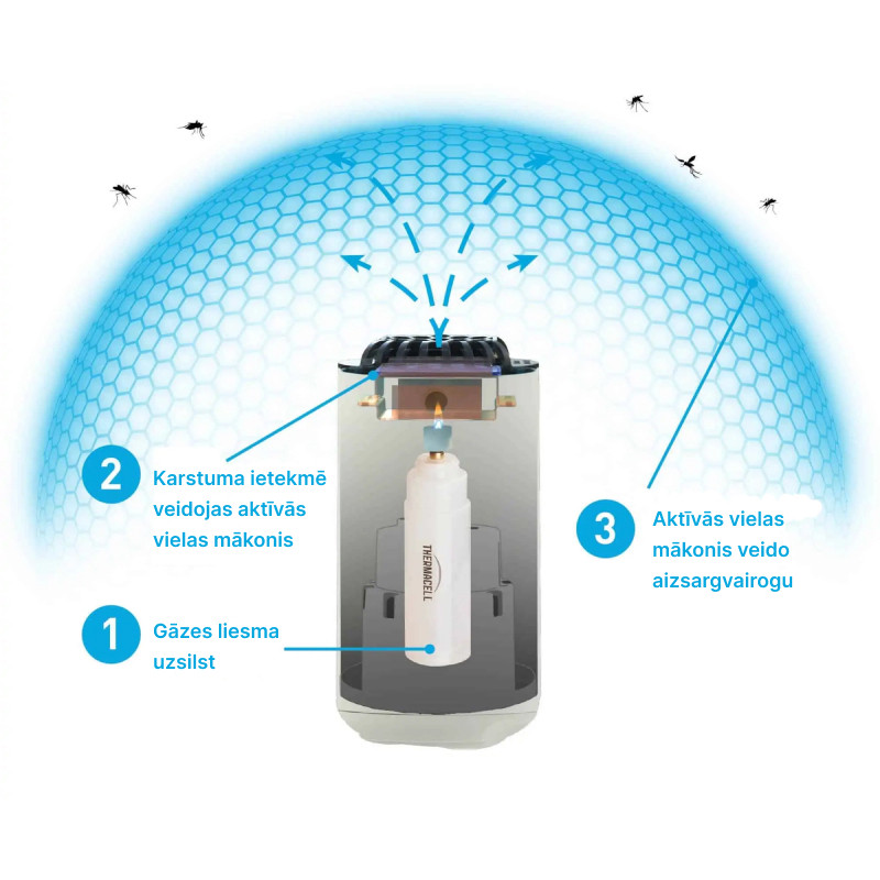 Nav vadu vai akumulatoru. Darbojas ar drošu un kompaktu 12 stundu degvielas kasetni. Izdala bez smaržas repelentu, kas aizdzen odus. Atbaidīšanas paklājiņi bez smaržas kalpo līdz pat 4 stundām un maina krāsu, kad laiks tos nomainīt.