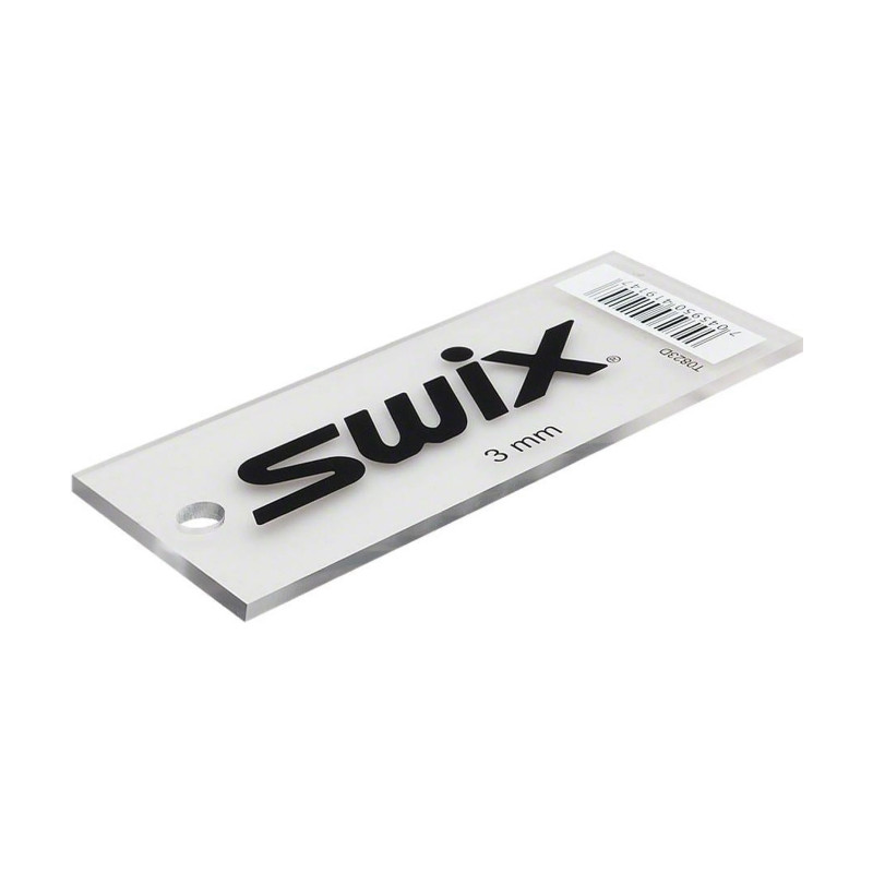 Pleksi skrāpis liekā slīdvaska noņemšanai uz pamatnes, 3 mm. Ir svarīgi, lai skrāpis vienmēr būtu ass. Tādējādi ir viegli un efektīvi strādāt uz pamatnes virsmas. Asiniet skrāpi, izmantojot Swix T0408, T410 un T412-220.